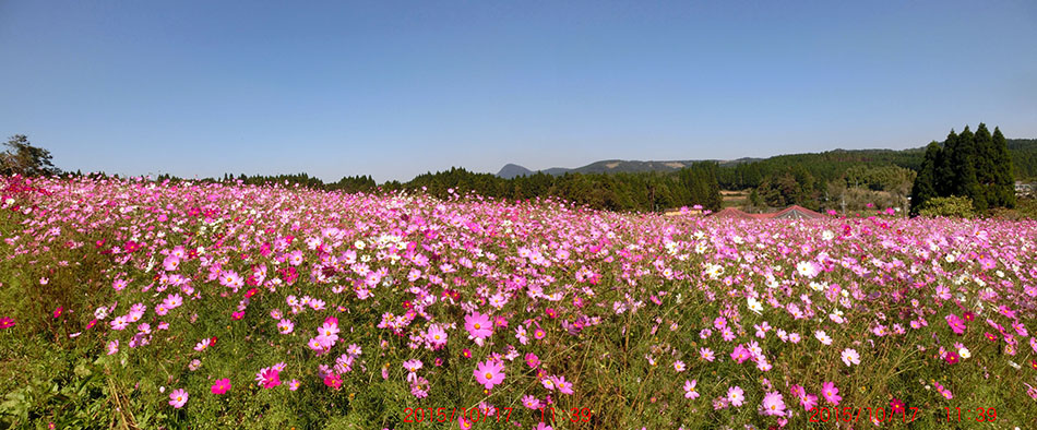 2015-10-17の上場高原のコスモス園です。広大な敷地に数十万本のコスモスが植えられています。この日は雲一つない青空で例年以上に綺麗に咲いていました。ミツバチもたくさん飛び回って蜜を集めていました。