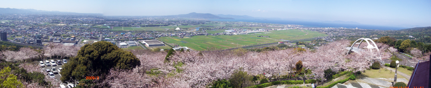 東光山は出水の東部にある小高い山で、頂上付近には桜がたくさん植えられている「東光山公園」があり、出水で一番の桜の名所となっています。そして、ご覧のように出水市街地や長島、天草方面も一望できる場所でもあります。